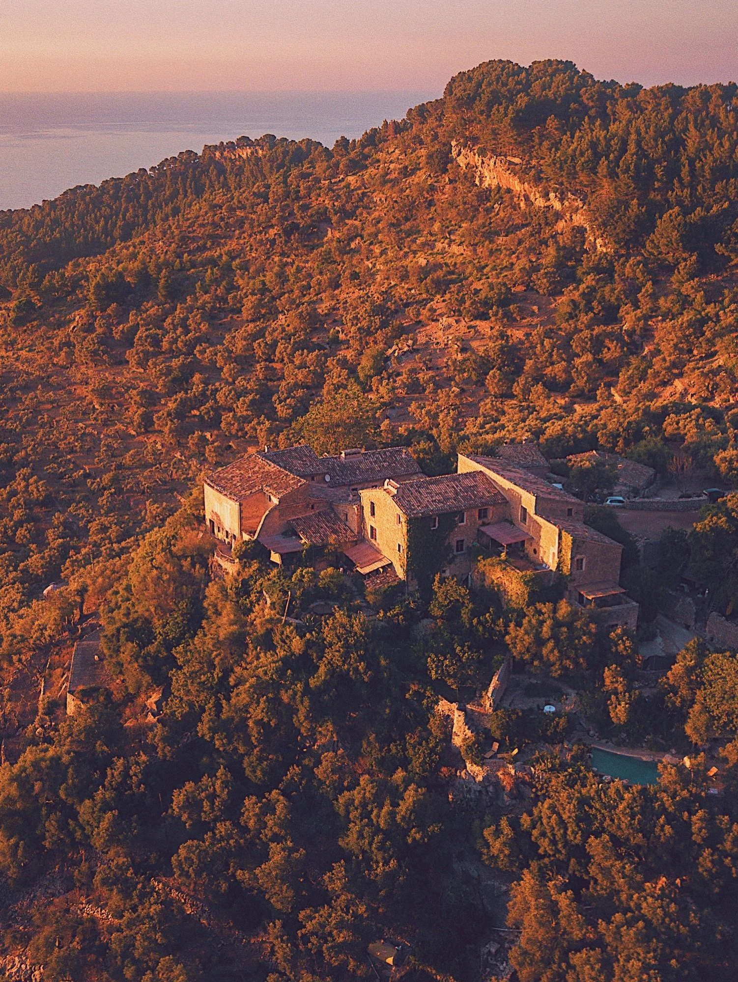 Once a 14th-century Templar monastery, Son Rullan occupies a rugged mountaintop position near Deià within Mallorca's UNESCO-listed Serra de Tramuntana. The estate preserves its original stone architecture: whitewashed lime walls, timber beams, and chambers connected across multiple levels through ancient staircases.