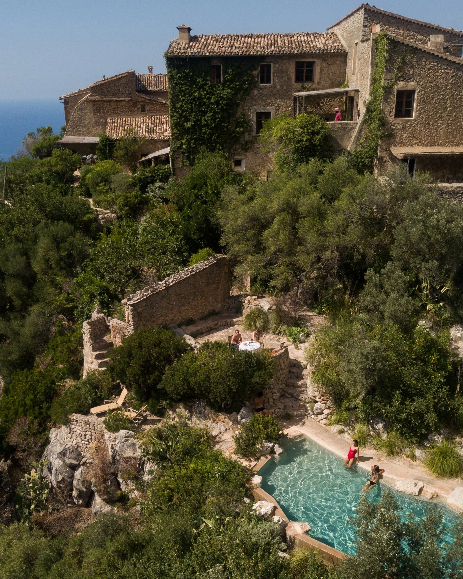 Son Rullan's singular architecture, gardens, pool and uninterrupted views across terraces to the Mediterranean.
